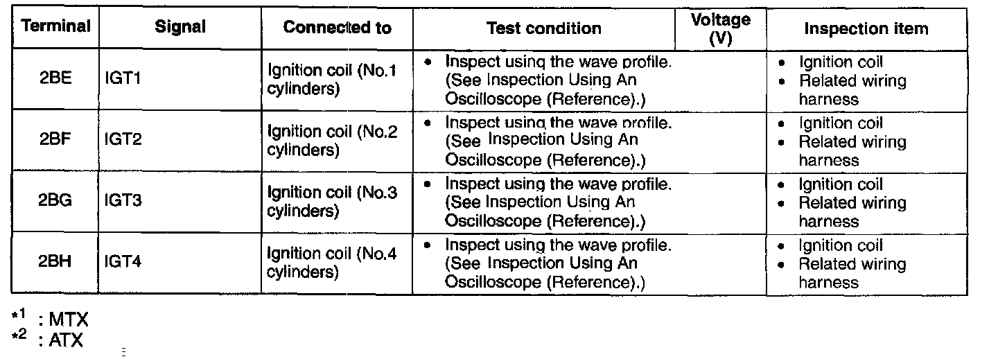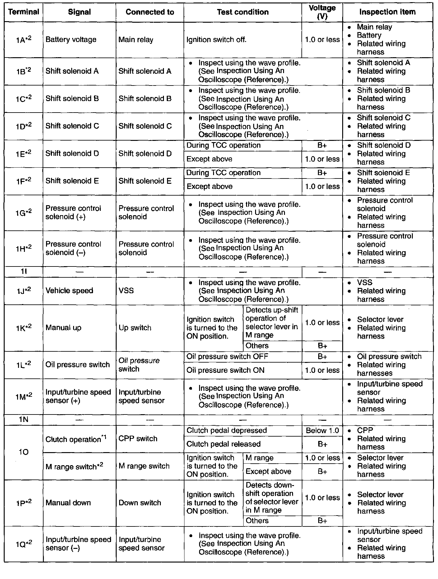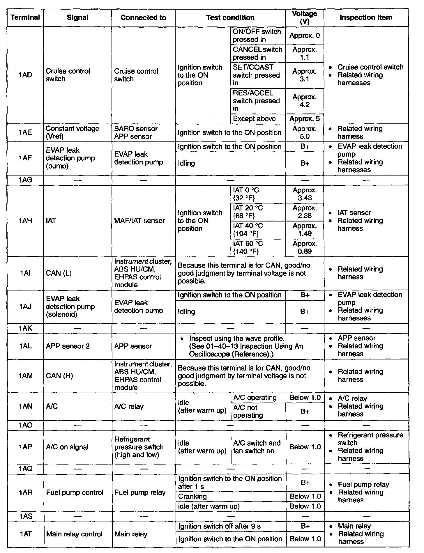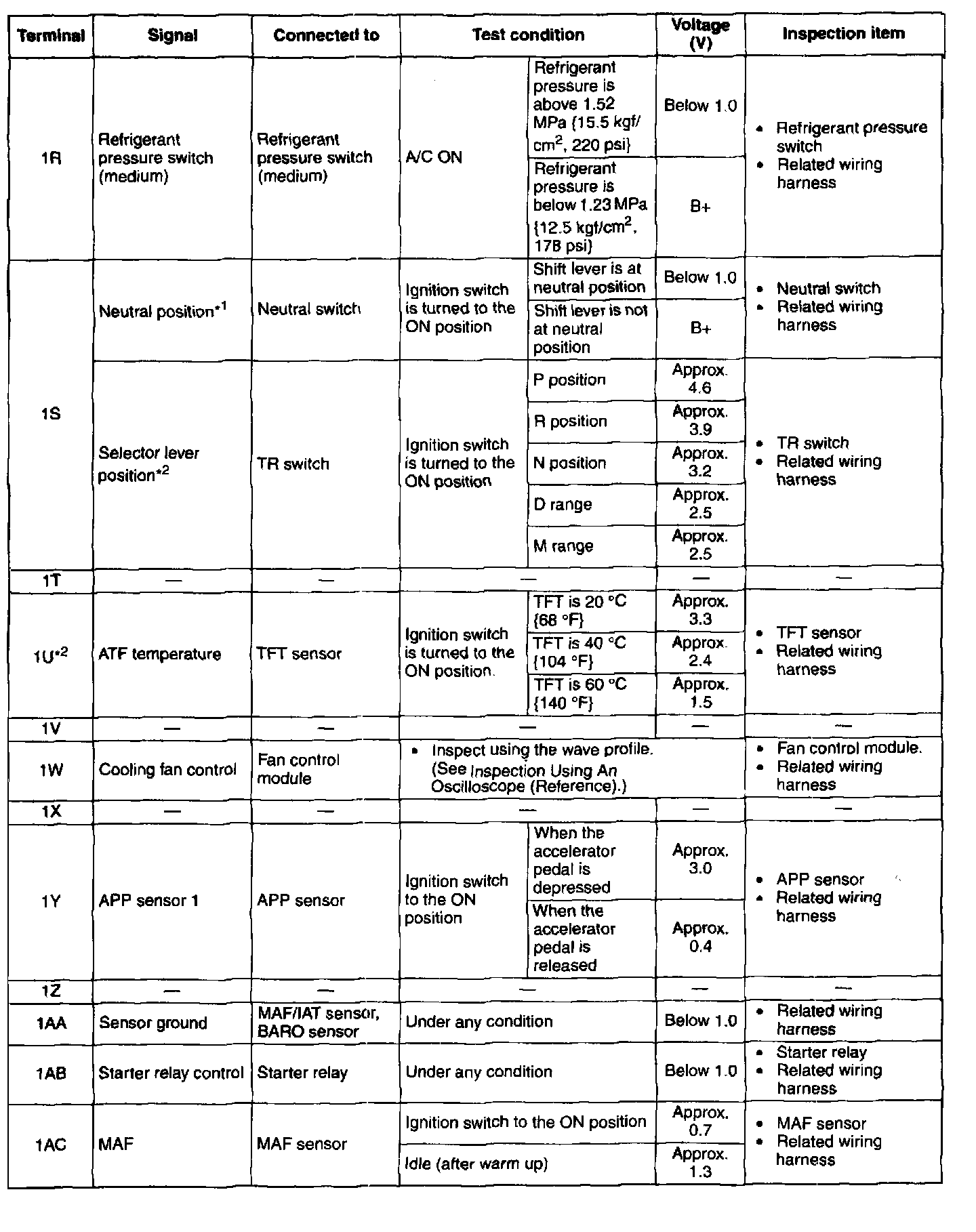NOTE: The PCM terminal voltage can vary with the conditions when measuring and changes due to aged deterioration on the vehicle, causing false diagnosis. Therefore determine comprehensively where the malfunction occurs among the input systems, output systems, and the PCM.