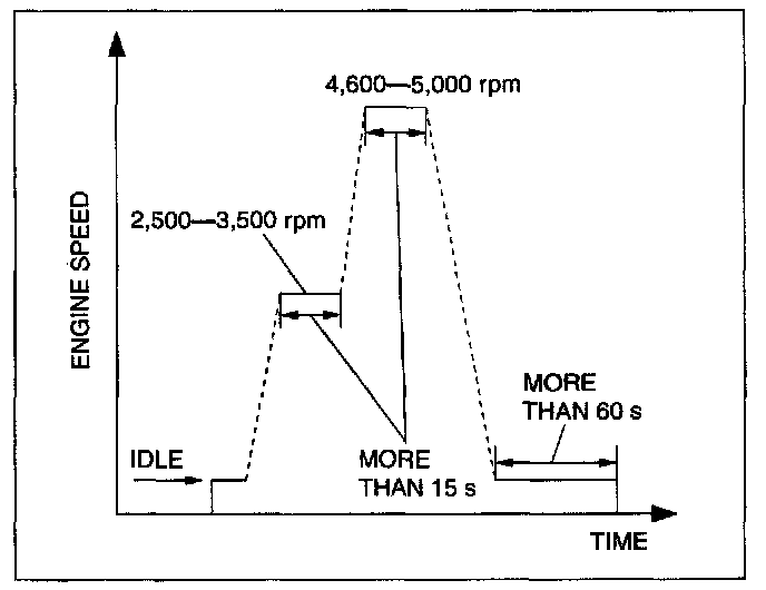 5. With the vehicle stopped, race the engine at the engine speed indicated, and then drive the vehicle as shown in the graph. The driving conditions before driving at constant speed are not specified. If possible, monitor RPM PID for enqine speed durinq this procedure.