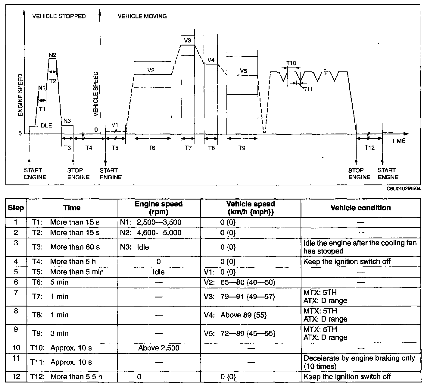 6. Drive the vehicle at an engine speed of 65-80 km/h [40-50 mph] for more than 5 minutes.