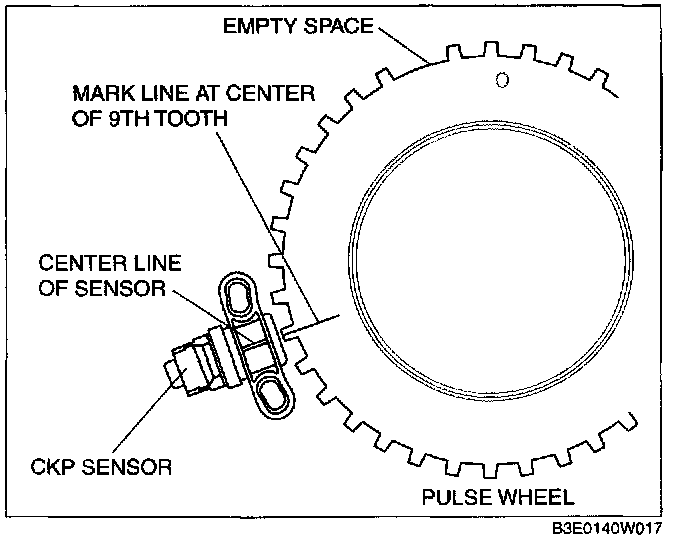 3. Install the CKP sensor where the center line marked in Step 2 and the CKP sensor center line are aligned.