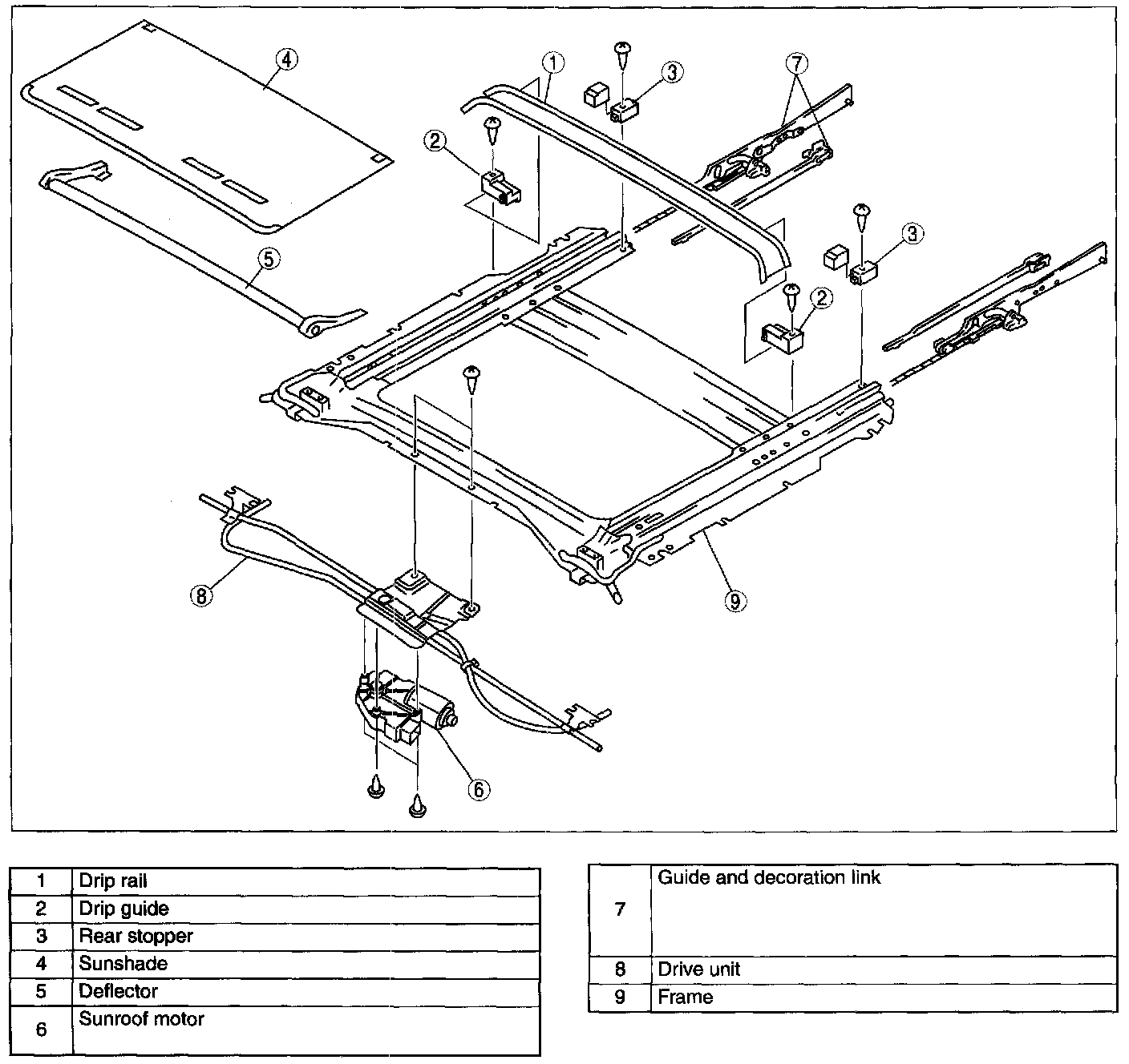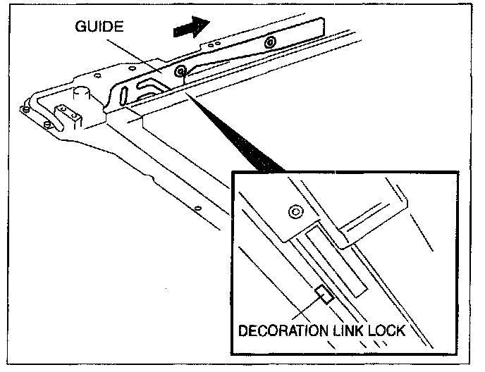 2. Slide the guide to the rear of the sunroof frame, and remove the guide and decoration link as a single unit.