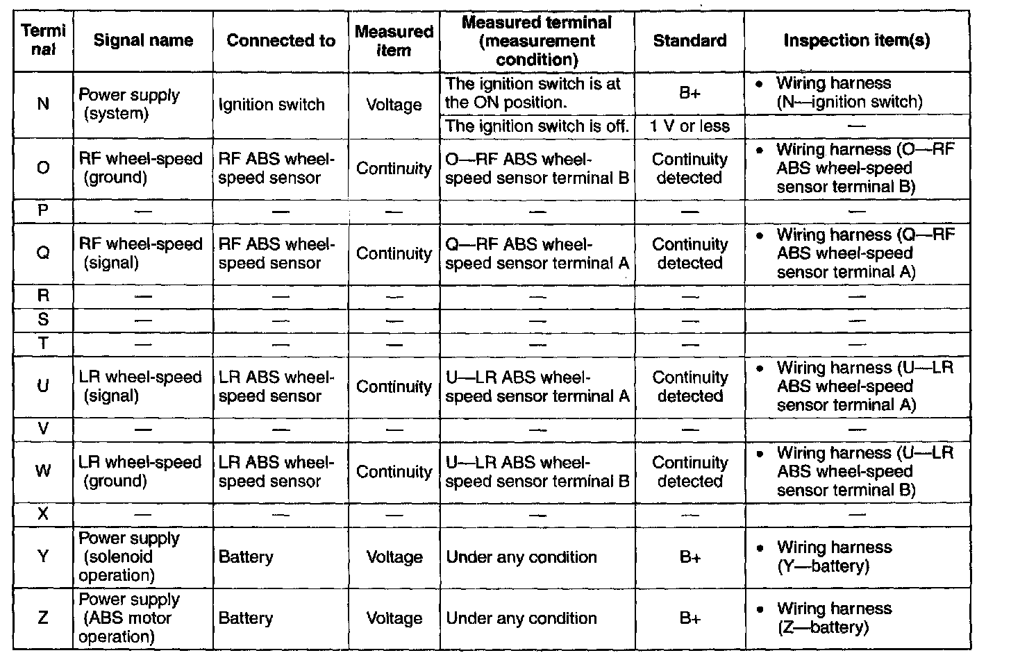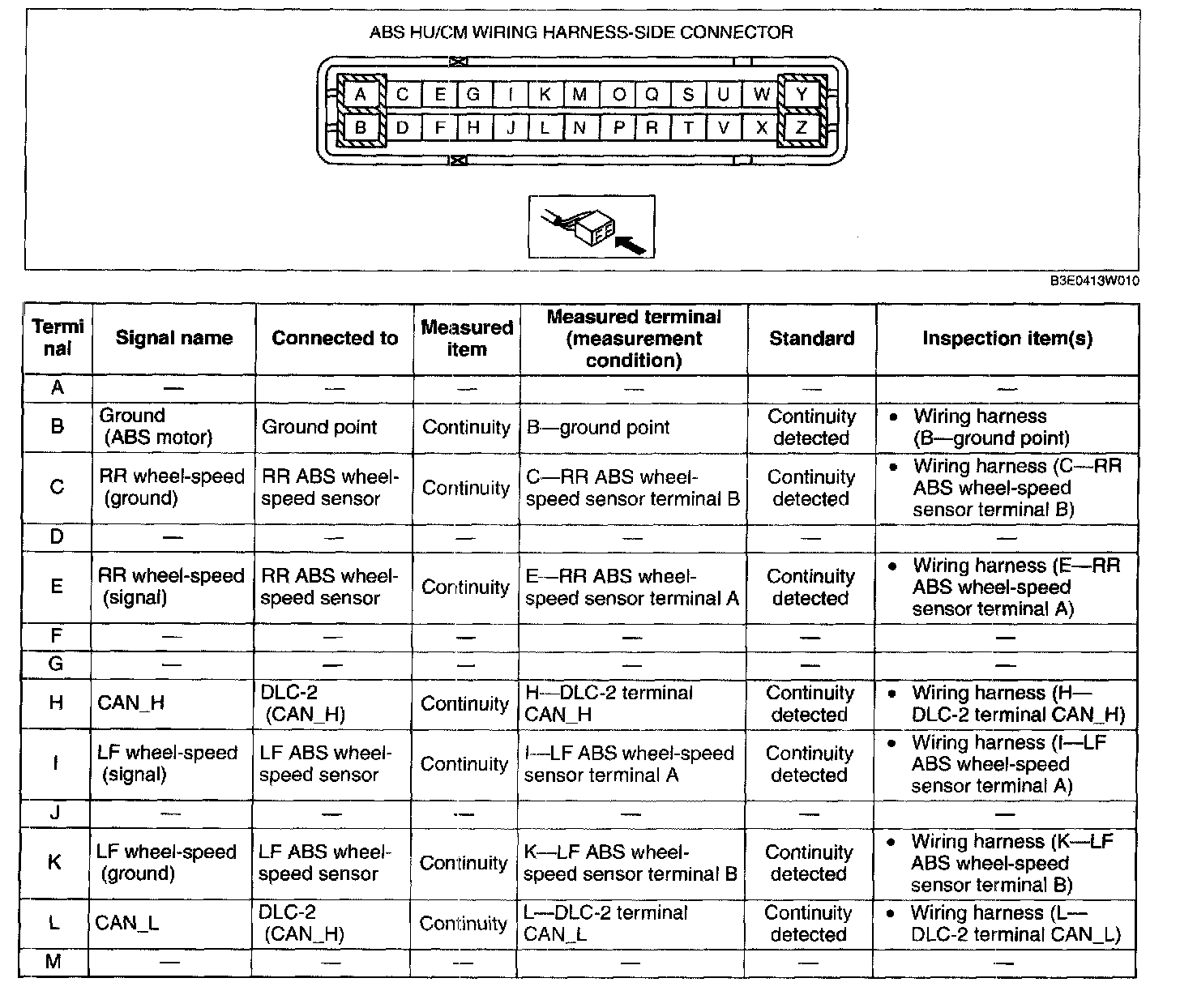 3. Attach the tester lead to the ABS HU/CM wiring harness-side connector, then inspect the voltage, continuity, or resistance according to the standard (reference) on the table.