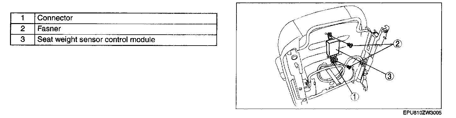 SEAT WEIGHT SENSOR CONTROL MODULE REMOVAL/INSTALLATIONCAUTION: When the seat weight sensor control module is replaced with a new one, perform the seat weight sensor calibration using the WDS or equivalent.
