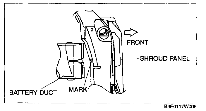 1. Match the mark of the shroud panel and notch in the battery duct, and install the battery duct to the shroud panel.