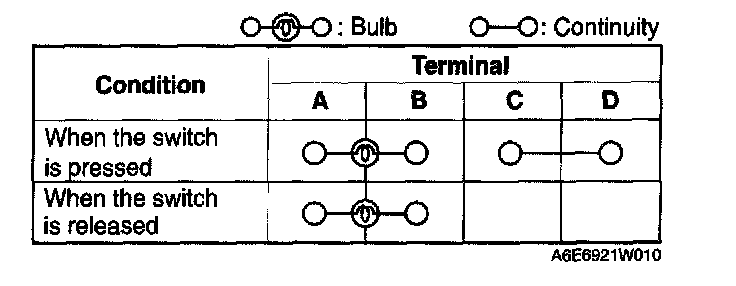Inspect for continuity between the TCS OFF switch terminals using an ohmmeter. If not as specified, replace the TCS OFF switch.