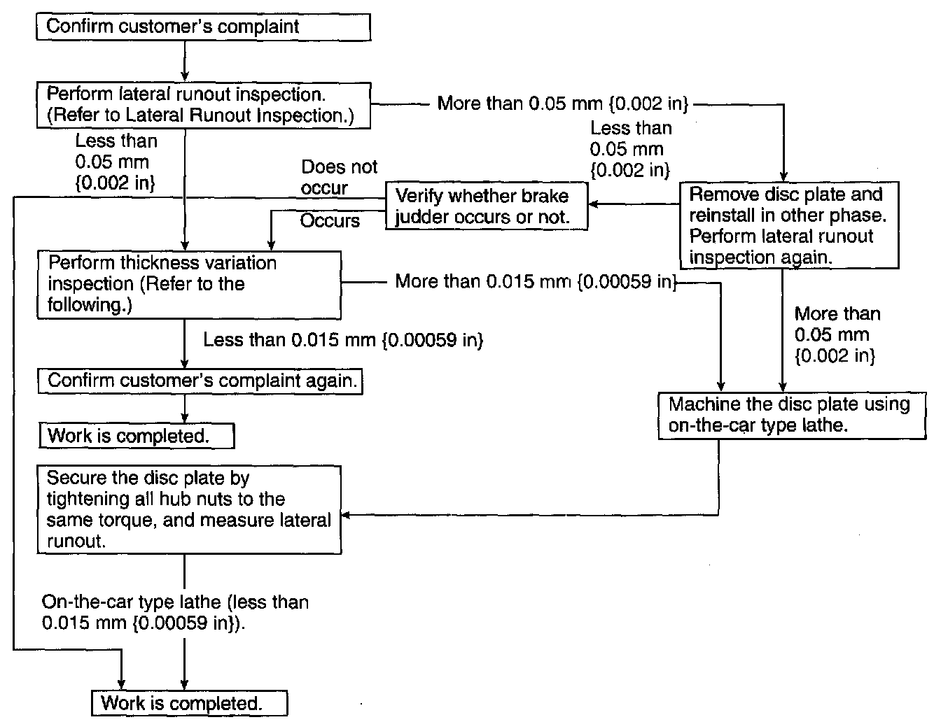 1. If the runout is more than 0.05 mm (0.002 inch) at the position 10 mm (0.39 inch) from the disc plate edge, uneven wear occurs on the disc plate because the pad contacts the plate unevenly.