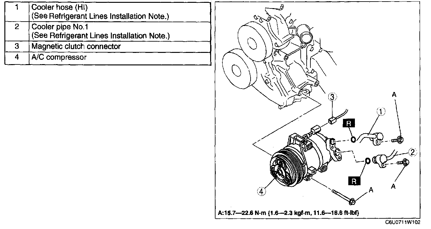 6. Remove in the order indicated in the table. Do not allow compressor oil to spill.