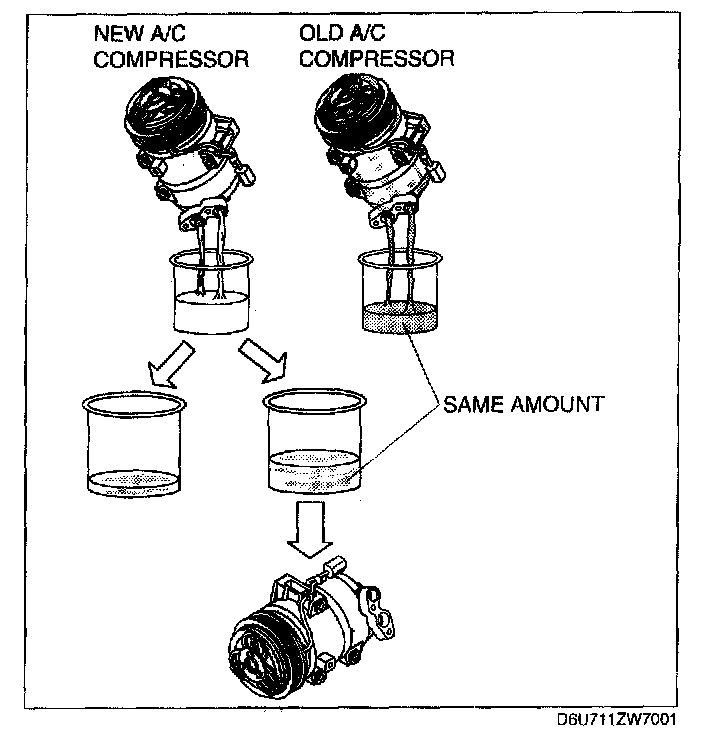 1. Rotate new A/C compressor shaft six to eight revolutions while collecting refrigerant oil in a clean measuring device. Use this refrigerant oil to refill new compressor. Do not allow refrigerant oil to become contaminated.