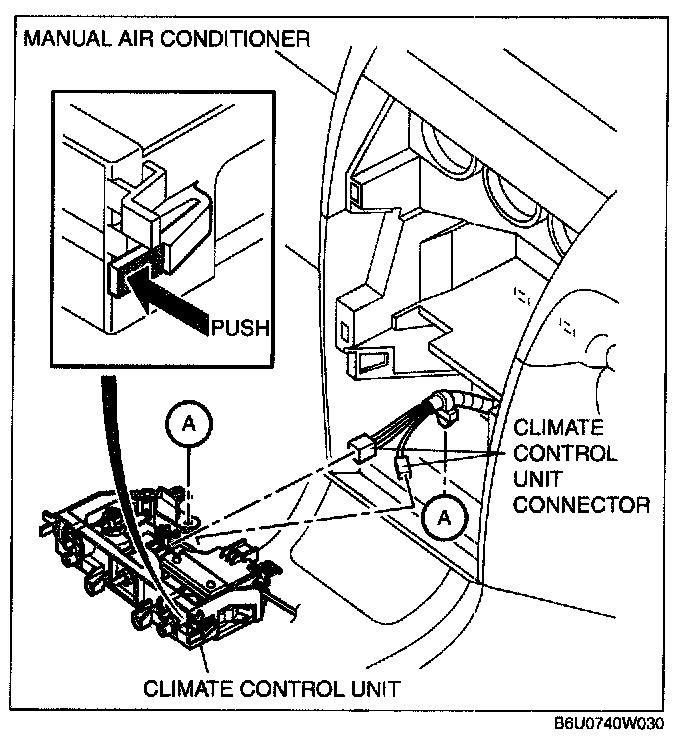 6. Disconnect the climate control unit connectors and remove the climate control unit. (Manual air conditioner)