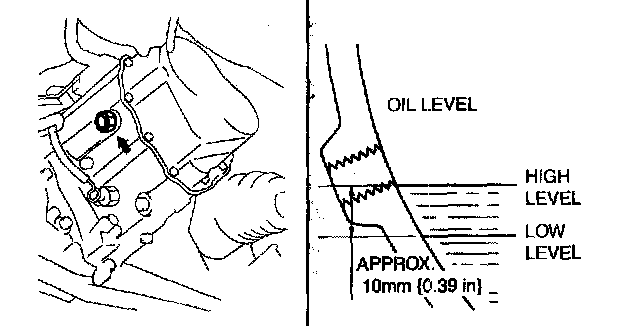 ^ If the oil level is lower than the low level, add the specified amount and type of oil through the oil level plug hole.