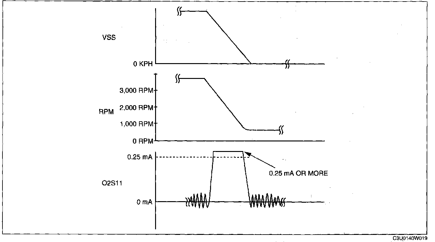 4. Verify that the front HO2S current (PID: 02S11) is 0.25 mA or more while decelerating as shown in the figure.