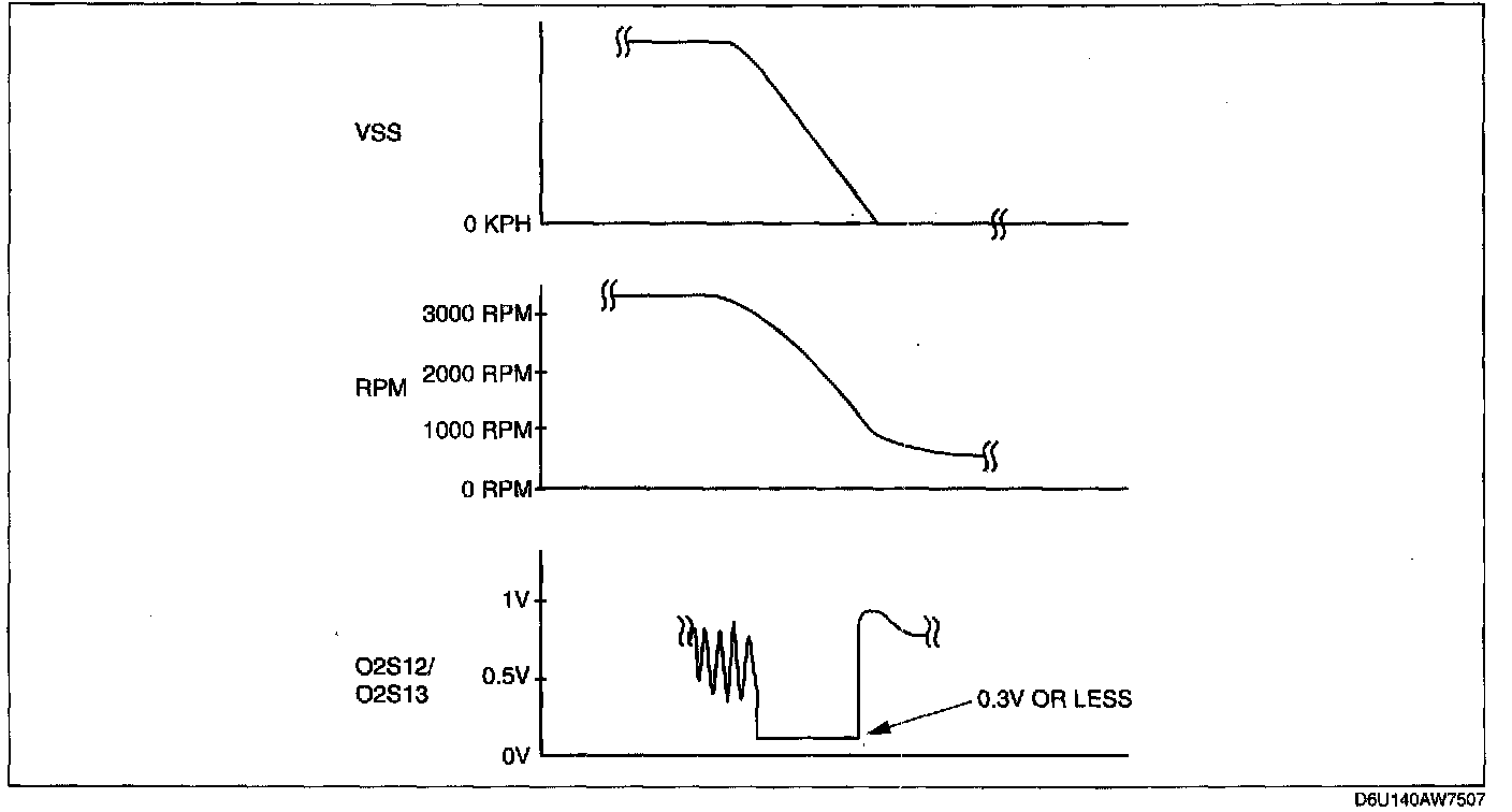 4. Verify that the middle/rear HO2S outputs a voltage of 0.6 V or more, one time or more, then verify that the middle/rear HO2S voltage (PID: 02S12/02S13) is 0.3 V or less while decelerating as shown in the figure.