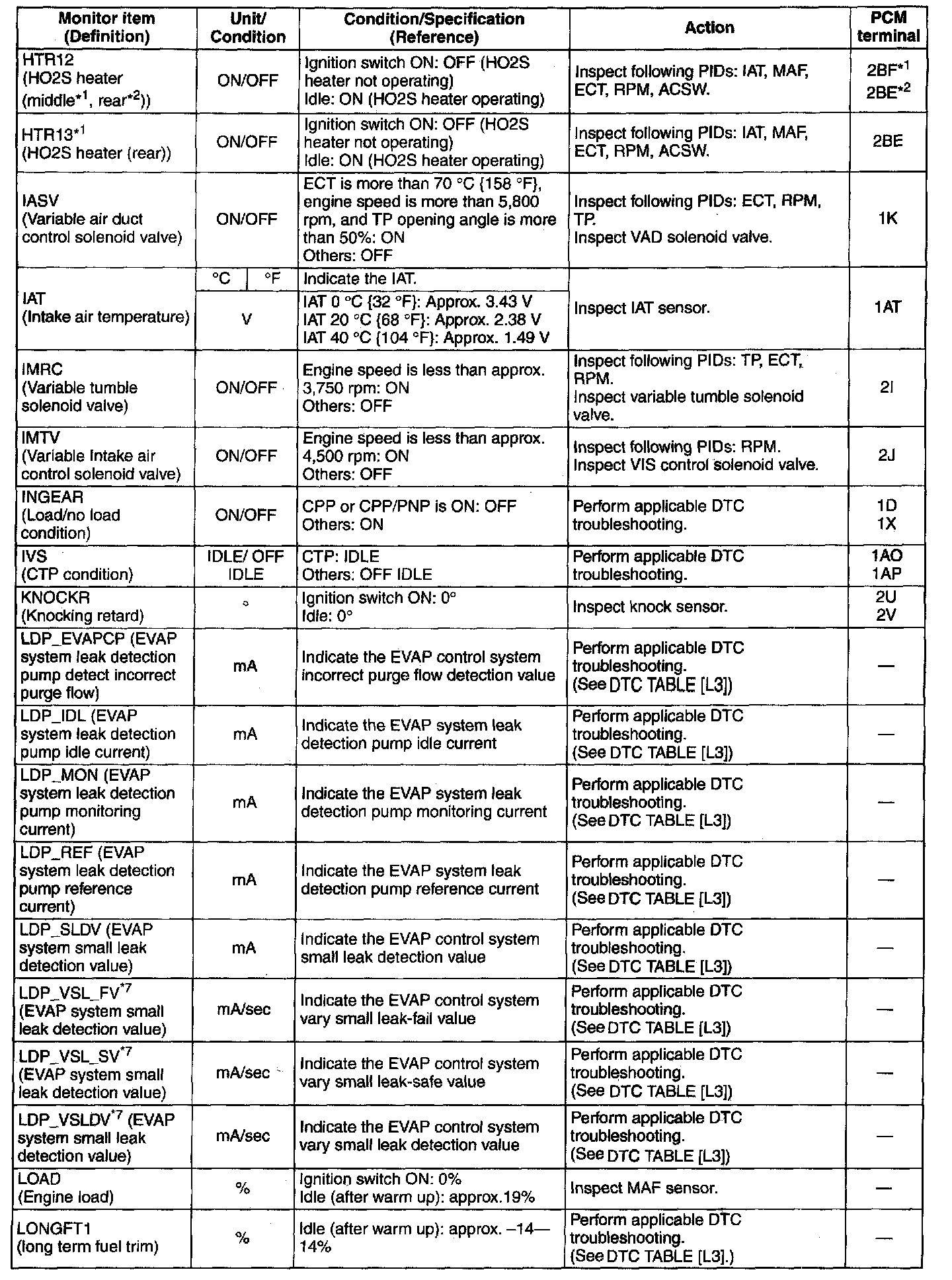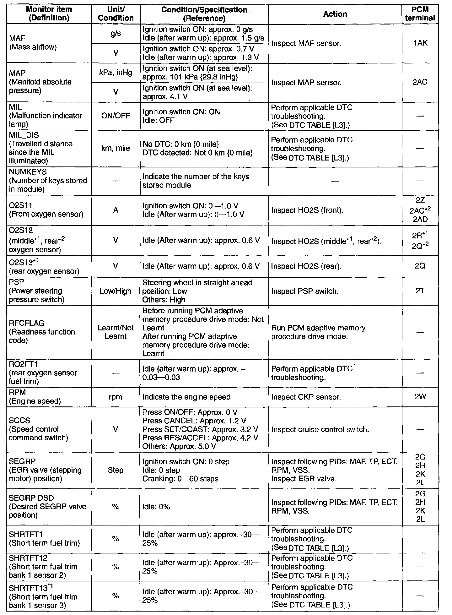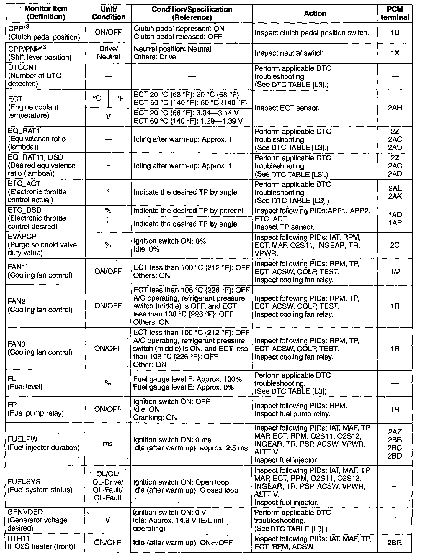 PID/DATA Monitor Table (Reference)