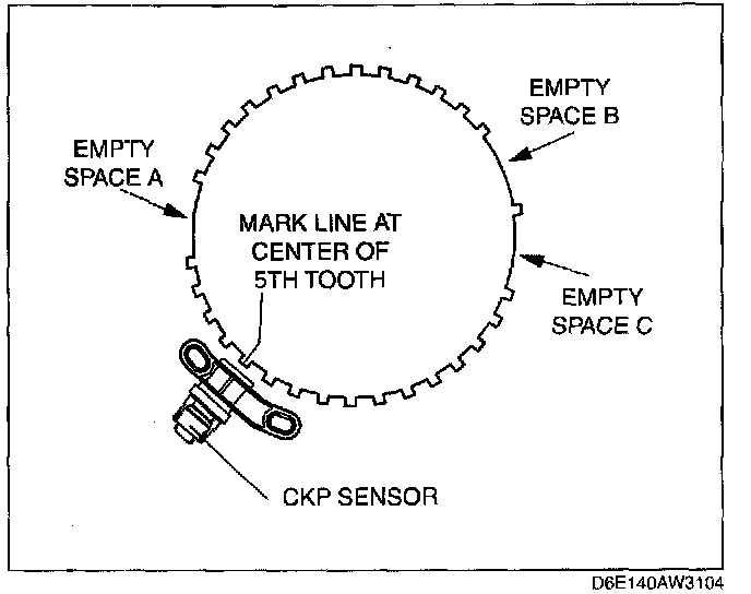 3. Fit the forked part of the CKP sensor installer with the fifth tooth (counting counterclockwise from the empty space A as shown in the figure) of the pulse wheel.
