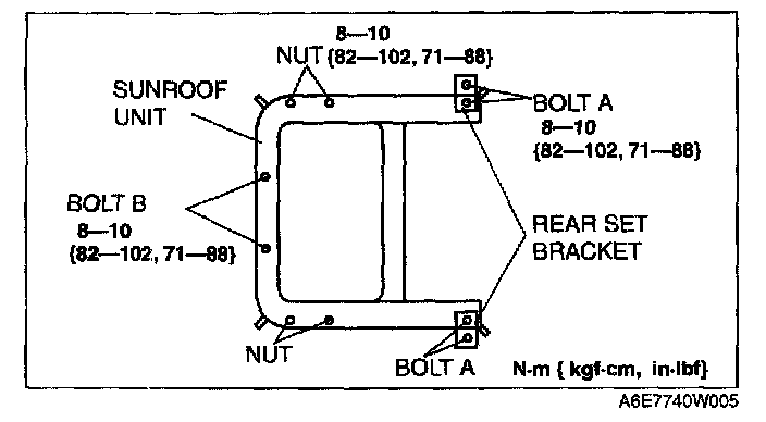 11. Remove the bolt B and nuts, and then remove the sunroof unit.
