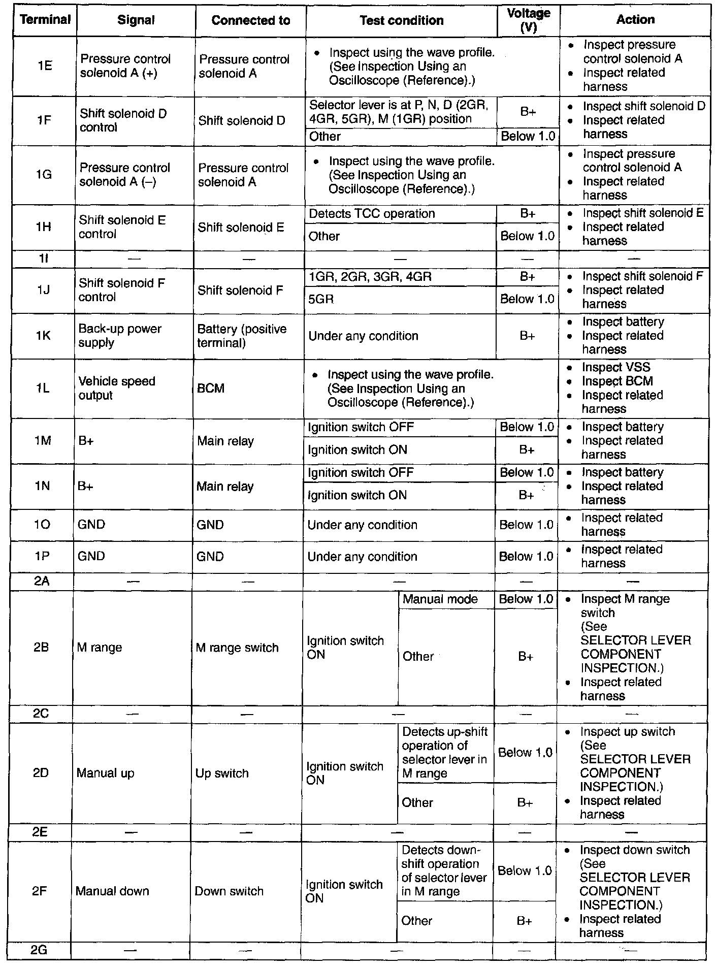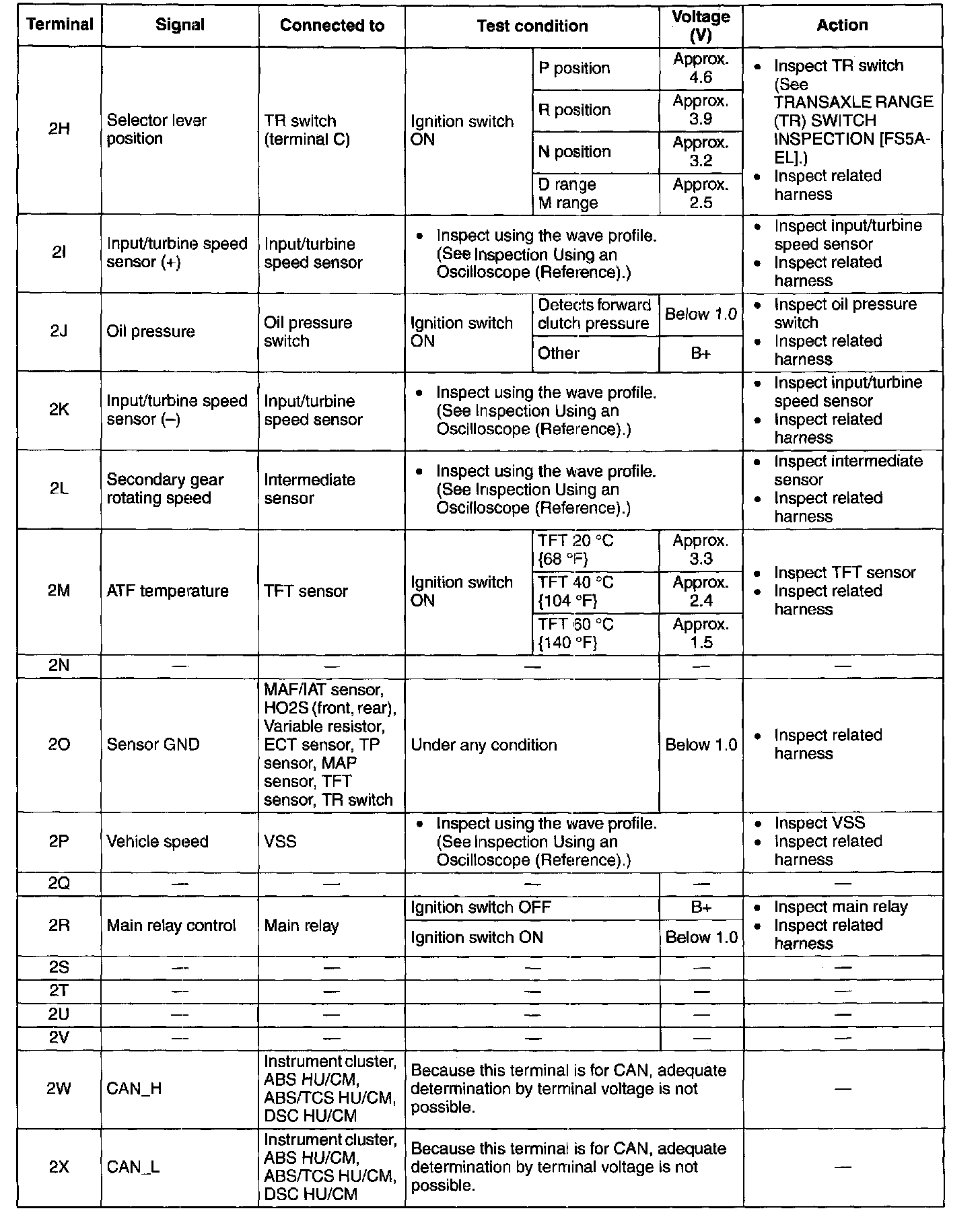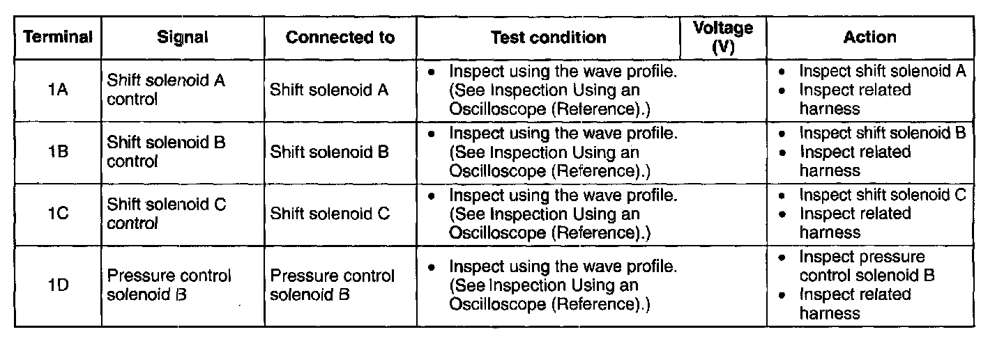 ^ The TCM terminal voltages vary with changes in measuring and vehicle conditions. Always carry out a total inspection of the input and output systems, and the TCM to determine the cause of trouble. Otherwise, a mis-diagnosis could occur.