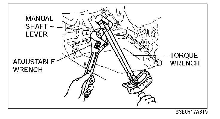 8) Set the adjustable wrench as shown to hold the manual shaft lever, and tighten the manual shaft nut.