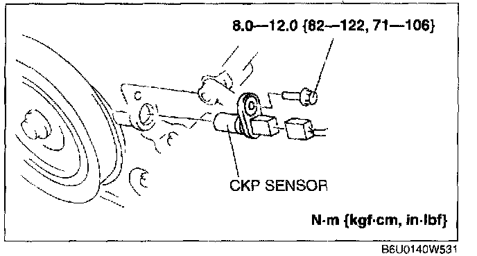 CRANKSHAFT POSITION (CKP) SENSOR REMOVAL/INSTALLATION [AJ]CAUTION: Do not forcefully pull the wiring harness of the CKP sensor. Doing so will break the harness.