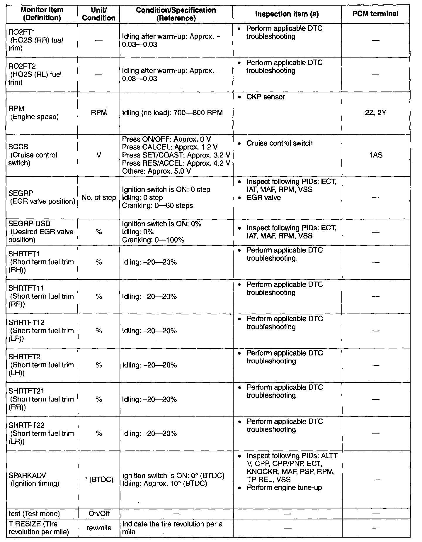 PID/DATA Monitor Table (Reference)