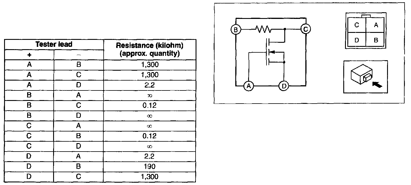 POWER METAL OXIDE SEMICONDUCTOR FIELD EFFECT TRANSISTOR (POWER MOS FET) INSPECTION1. Verify that the resistance between the terminals of the power MOS FET is as shown in the table.