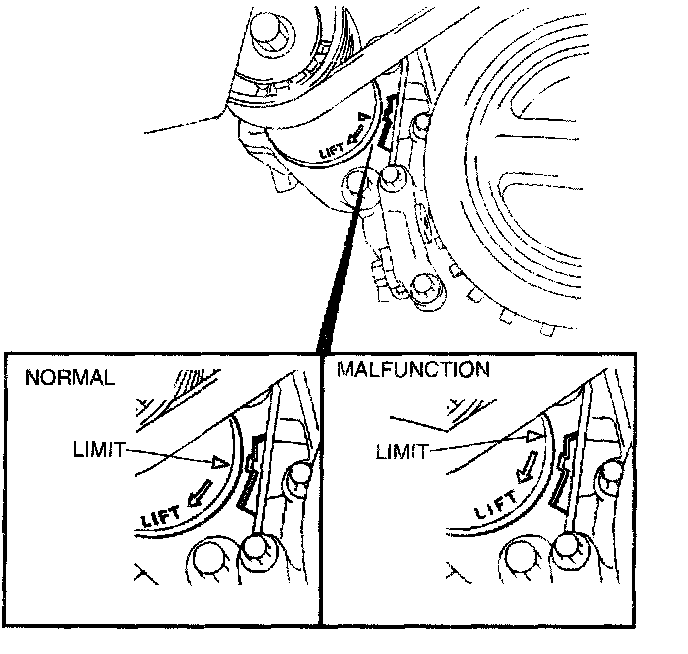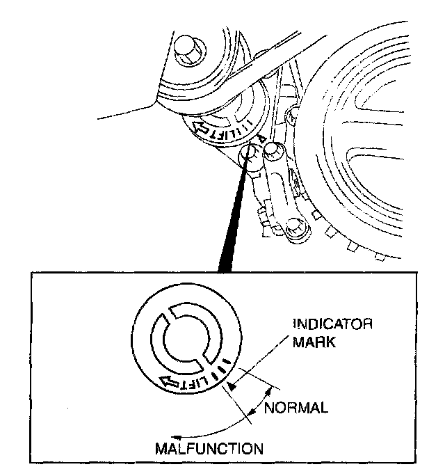 2. Verify that the drive belt auto tensioner indicator mark does not exceed the limit.