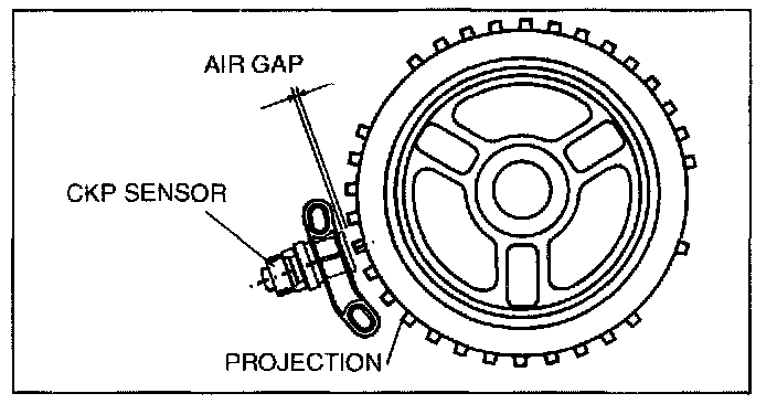 2. Using a thickness gauge, measure the air gap between the plate projections at the back of crankshaft pulley and the CKP sensor.