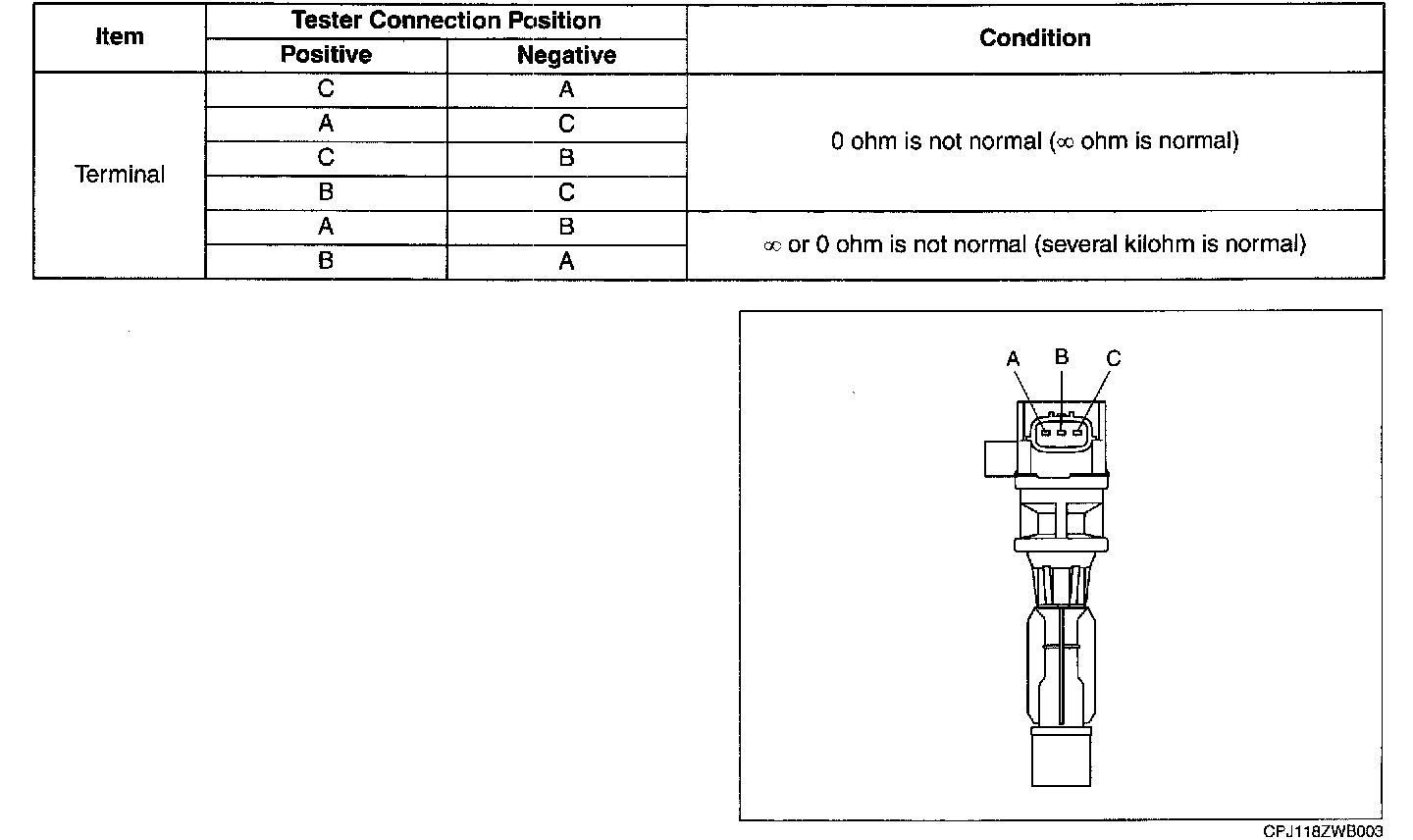 2. Measure the resistance between each terminal on the ignition coil connector using an analog circuit tester.