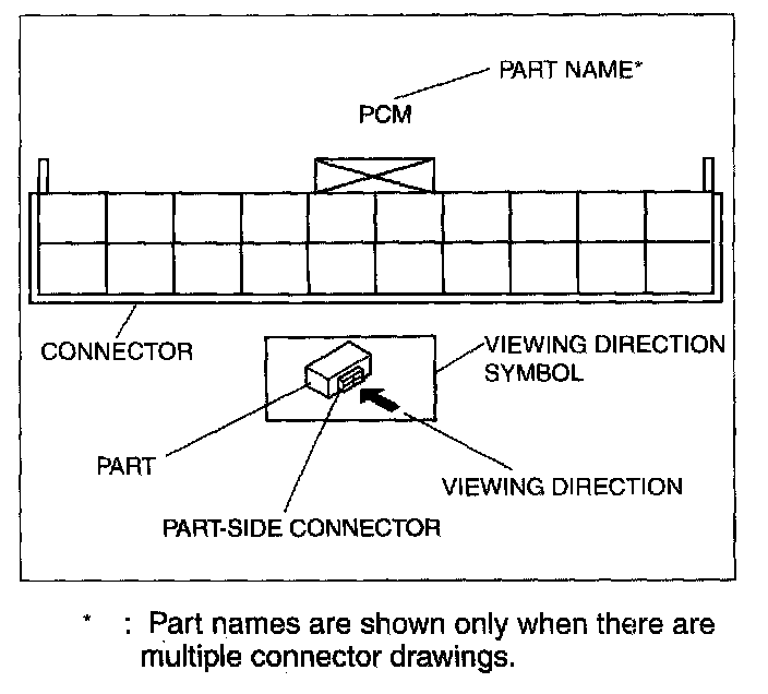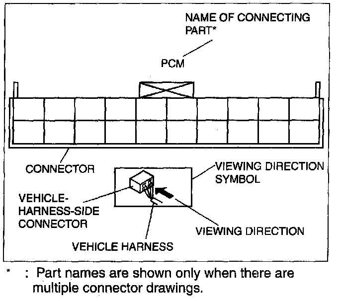 When it is necessary to show the terminal side of vehicle harness-side connectors, such as the following connectors, the viewing direction is from the terminal side.