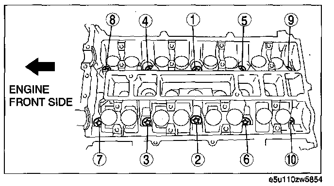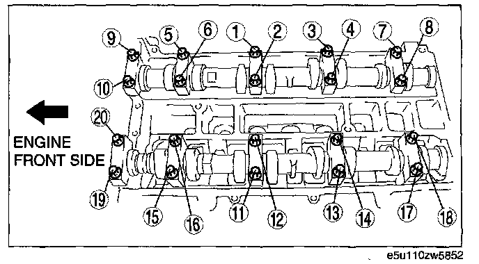 Tighten the camshaft cap bolts in the order shown with the following two steps.