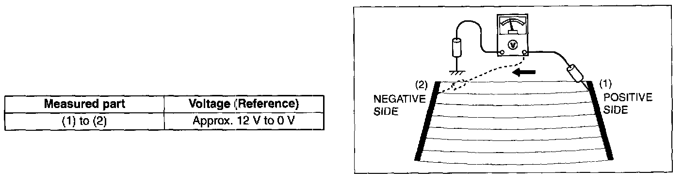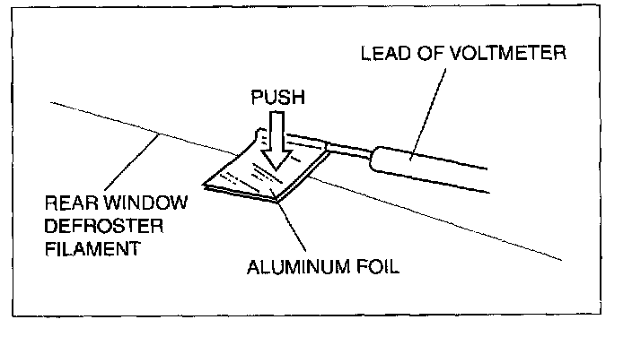 CAUTION: Directly touching the rear window defroster filament with the lead of the voltmeter could damage it. Wrap aluminum foil around the end of the lead and test the rear window defroster filament by touching it with the foil.