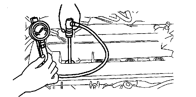 5) It it is less than the minimum specification, or there is a cylinder with a compression value that differs from that of other cylinders by 196.1 kPa or more (2.0 kgf/cm2, 28.5 psi), add a small quantity of engine oil through the spark plug hole and perform Steps (1) to (3).