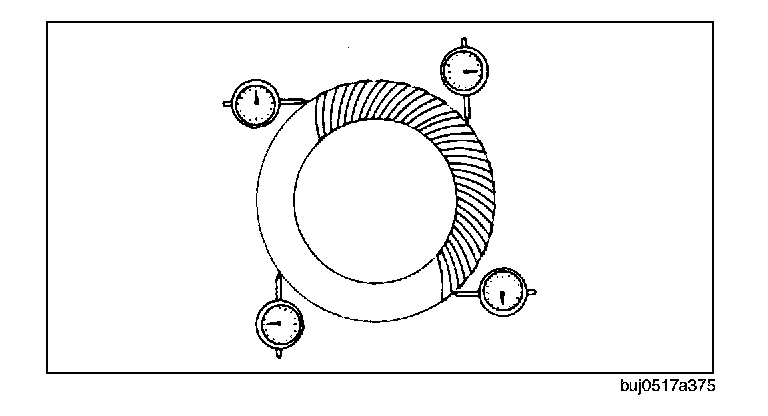 Caution: Perform the backlash measurement on the ring gear circumference at four points.