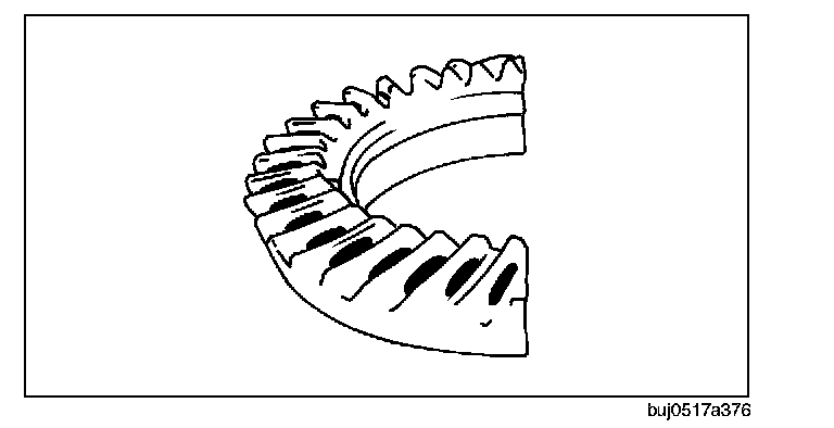 3) Inspect for gear tooth contact at four points on the ring gear circumference and verify that the gear tooth contact indicated by the tooth marking compound is as indicated in the figure.