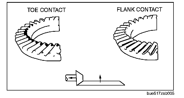 4) If toe and flank contact is indicated as shown in the figure, replace the drive pinion spacer with a thinner one to maintain the drive pinion further away.