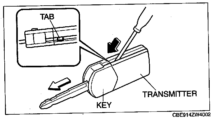 1. Insert a small screwdriver into the slot and push the tab to remove the key from the transmitter.