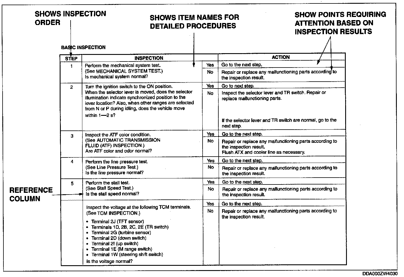- Although inspections and adjustments are performed according to the reference column procedures, if the cause of the malfunction is discovered during basic inspection, continue the procedures as indicated in the action column.