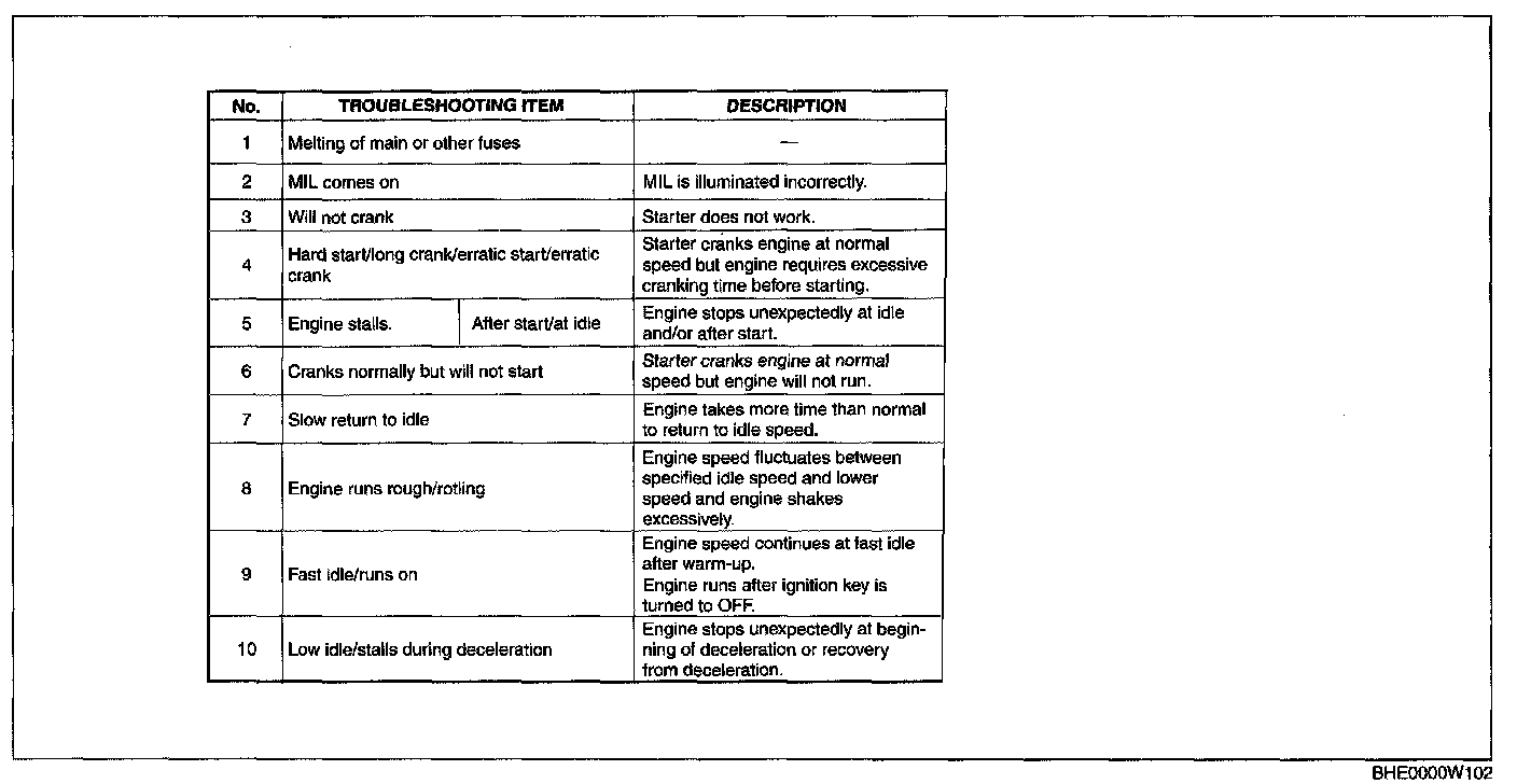 - The quick diagnosis chart lists diagnosis and inspection procedures to be performed specifically relating to the cause of the malfunction.