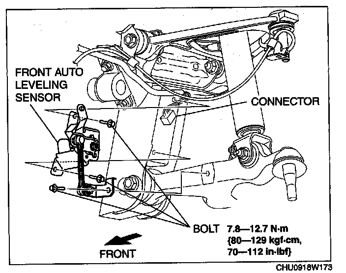 4. Remove the bolts and then remove the front auto leveling sensor.