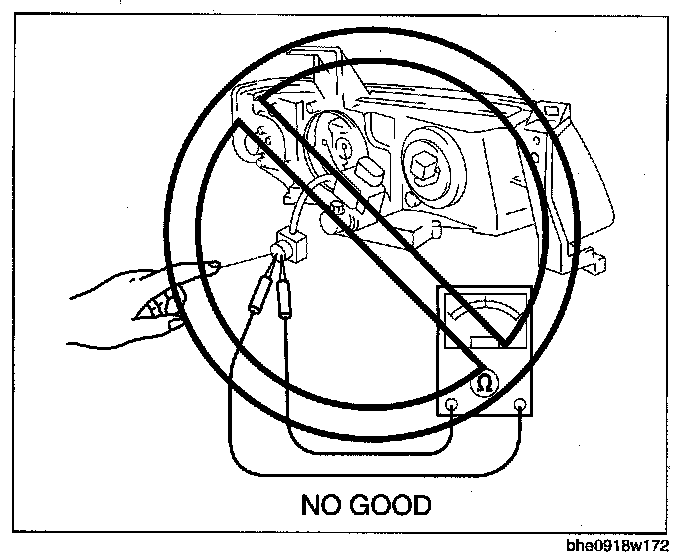 - When the light switch is on, approx. 25,000 V of high voltage passes through the discharge headlight bulb socket. Because of the danger of electrical shock, do not Insert fingers or a tester.