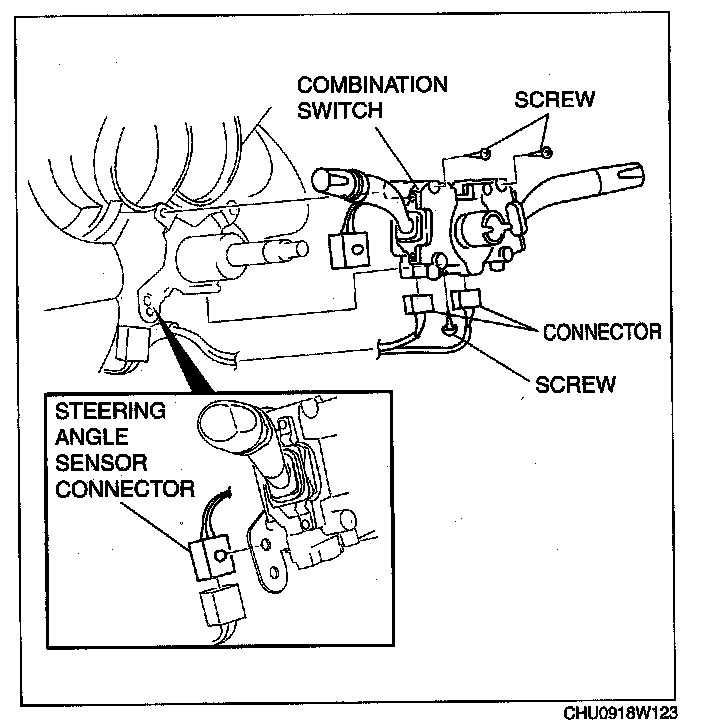 COMBINATION SWITCH REMOVAL/INSTALLATIONWARNING: For vehicles with DSC, if the negative battery cable or the steering angle sensor connector is disconnected, the stored initial position of the steering angle sensor will be cleared and the DSC will not operate properly, making the vehicle unsafe to drive. Perform the steering angle sensor initialization procedure after connecting the negative battery cable.