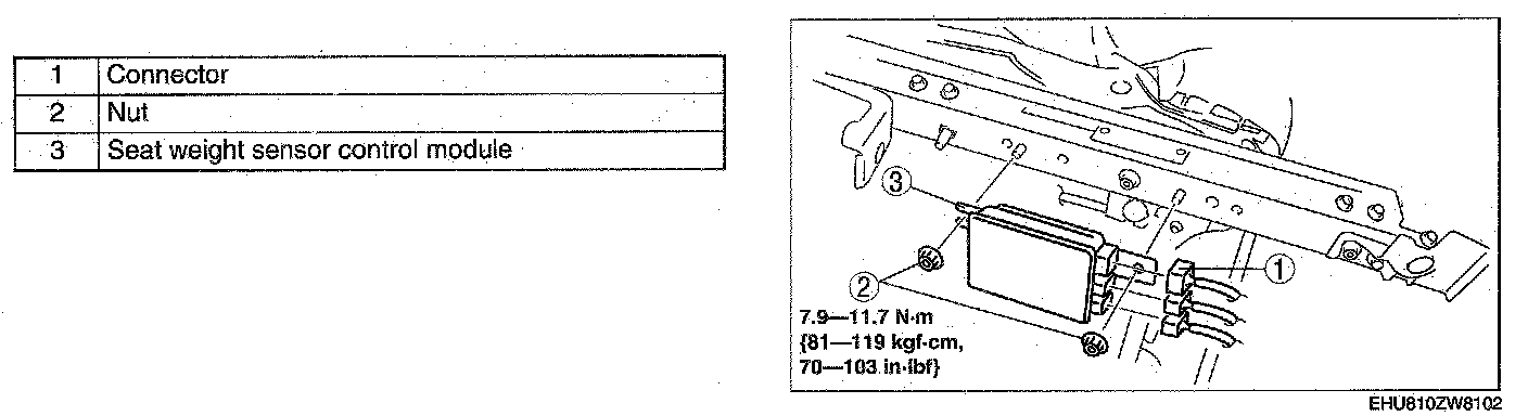 SEAT WEIGHT SENSOR CONTROL MODULE REMOVAL/INSTALLATIONCAUTION: When the seat weight sensor control module is replaced with a new one, perform the seat weight sensor calibration using the M-MDS.