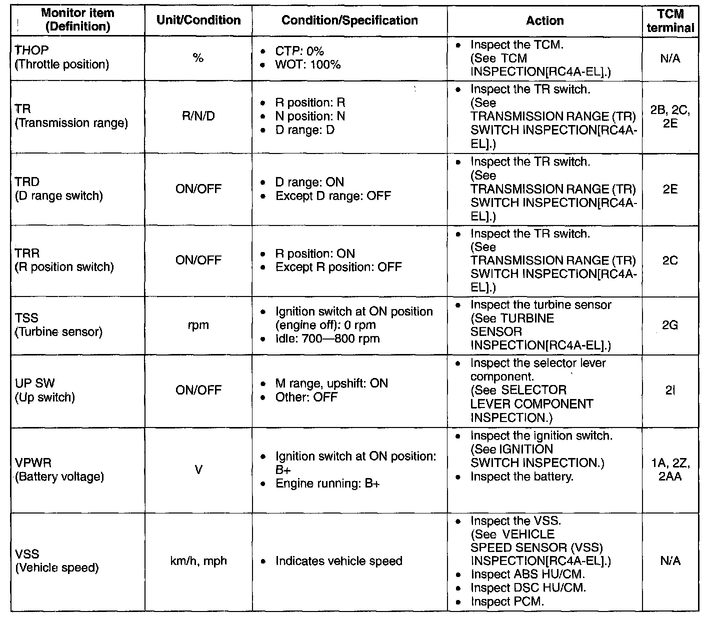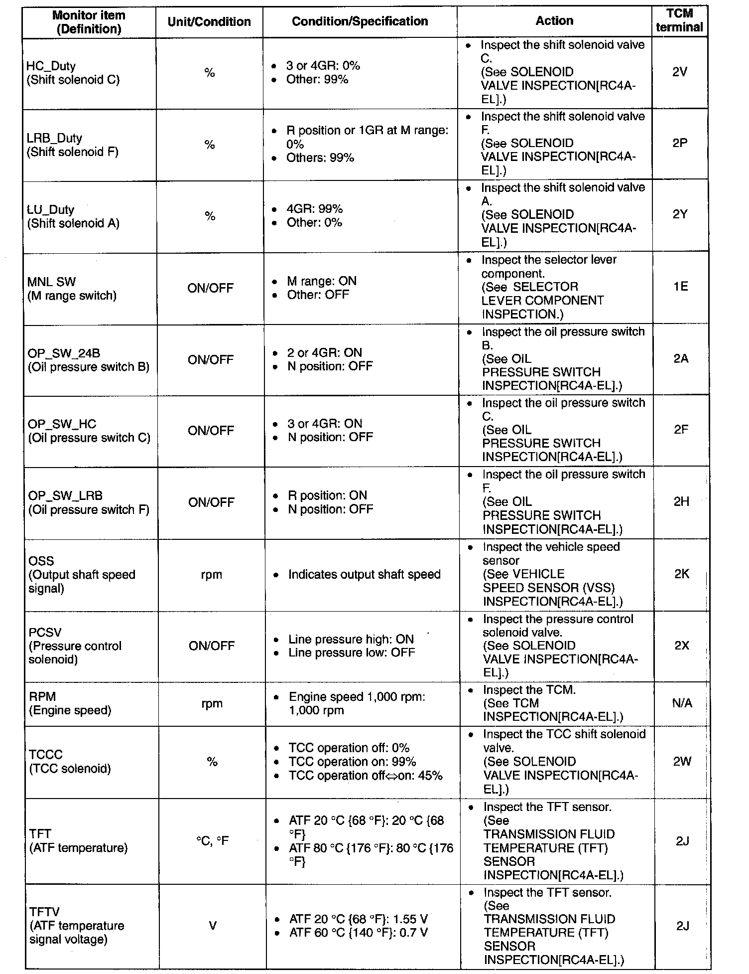 ^ The PID/DATA MONITOR function monitors the calculated value of the input/output signals in the TCM. Therefore, if a monitored value of an output device is not within specification, it is necessary to inspect the monitored value of the input device related to the output device control. Since an output device malfunction is not directly indicated as a malfunction of the monitored value for the output device, it is necessary to inspect the output device individually using the simulation function.