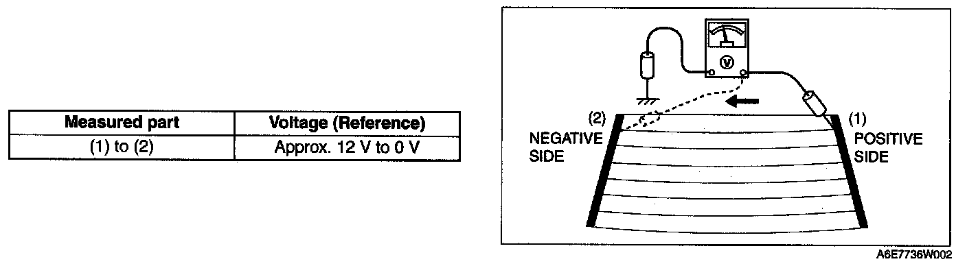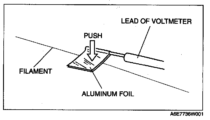 CAUTION: Directly touching the rear window defroster filament with the lead of the voltmeter could damage it. Wrap aluminum foil around the end of the lead and test the filament by touching it with the foil.