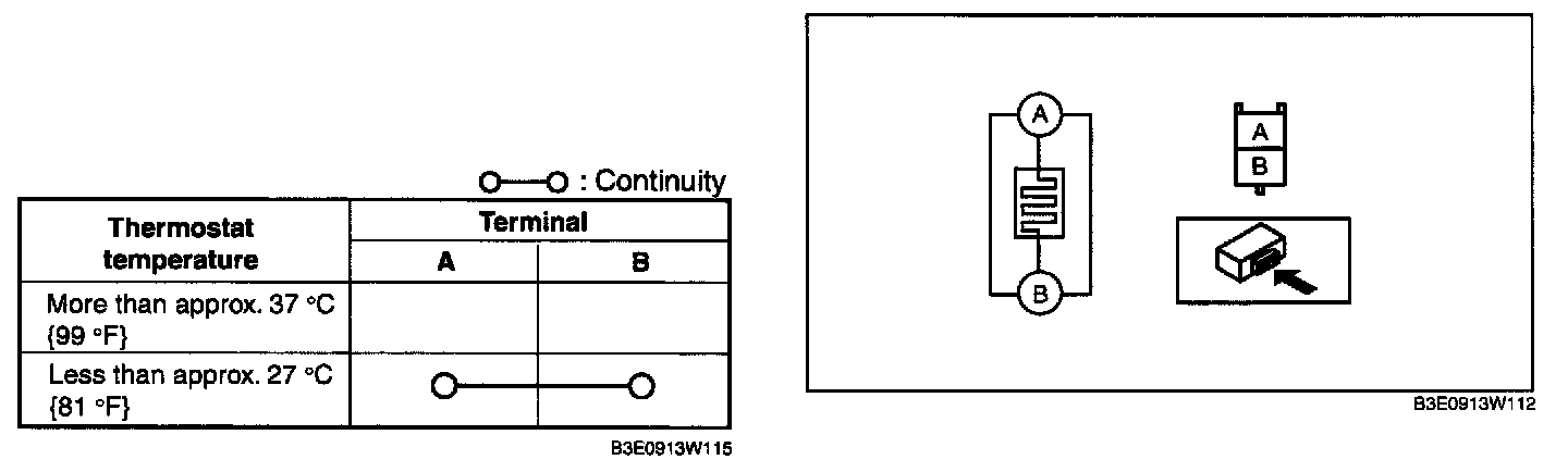 3. While inspecting for continuity between the terminals A and B of the connector, use a dryer to warm the thermostat of the seat warmer unit on seat cushion.