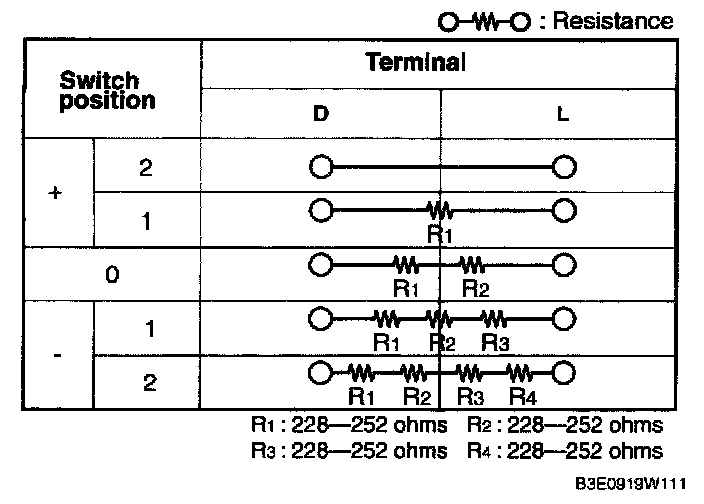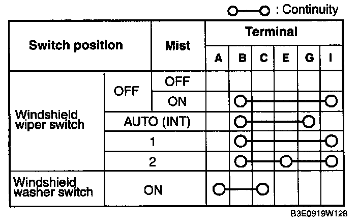 1. Verify that the continuity between the windshield wiper and washer switch is as indicated in the table.