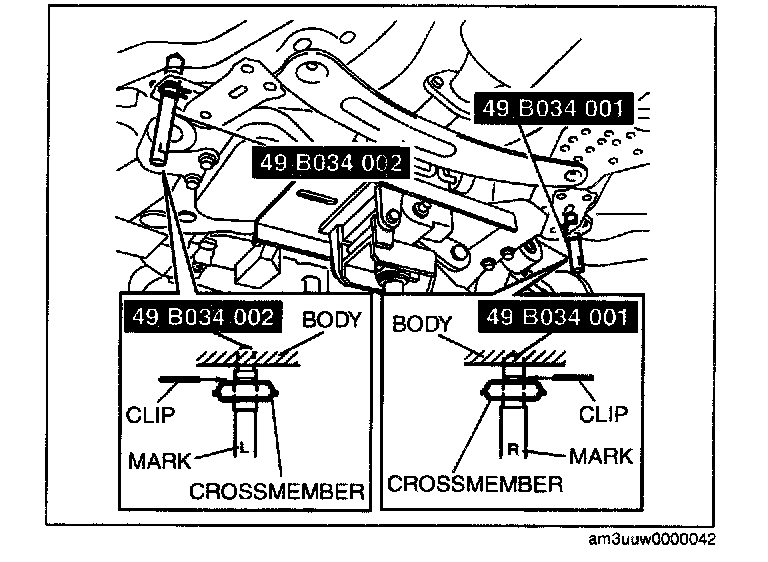 1. Verify the left and right identification marks and install the positioning SST to the front crossmember.