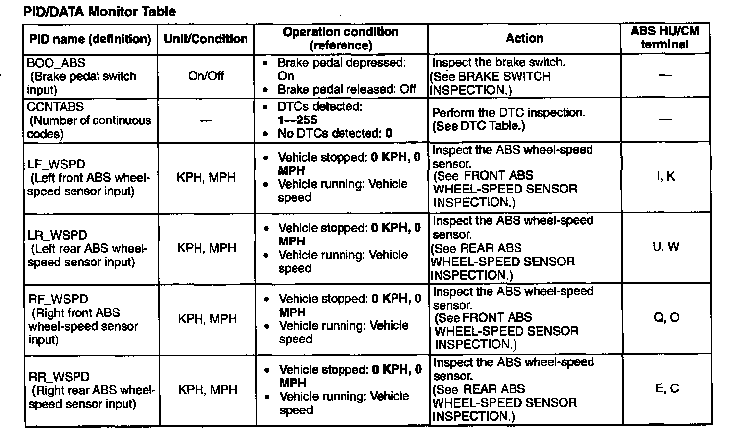 PID/DATA Monitor Table: