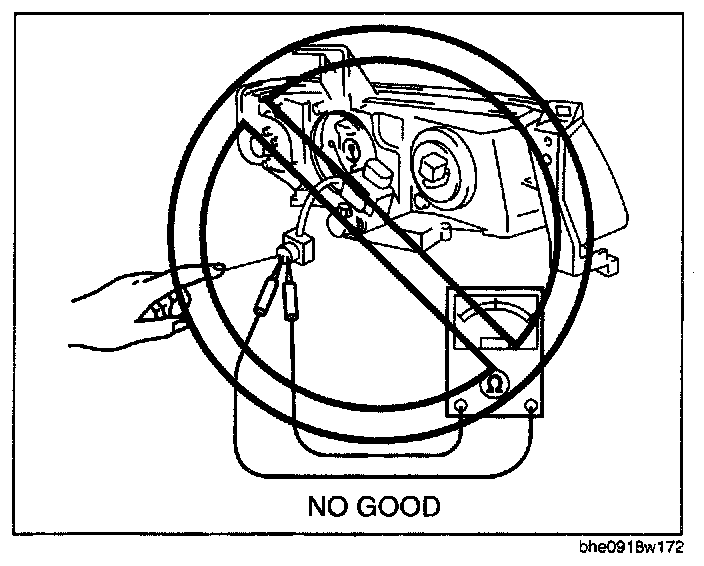 - Verify that the discharge headlights illuminate normally by testing them several times under cold illumination (headlights oft for approx. 10 mm or more and then turned on) and hot illumination (headlights on for approx. 15 mm or more, turned off for approx. 1 mm, and then turned on again) conditions.