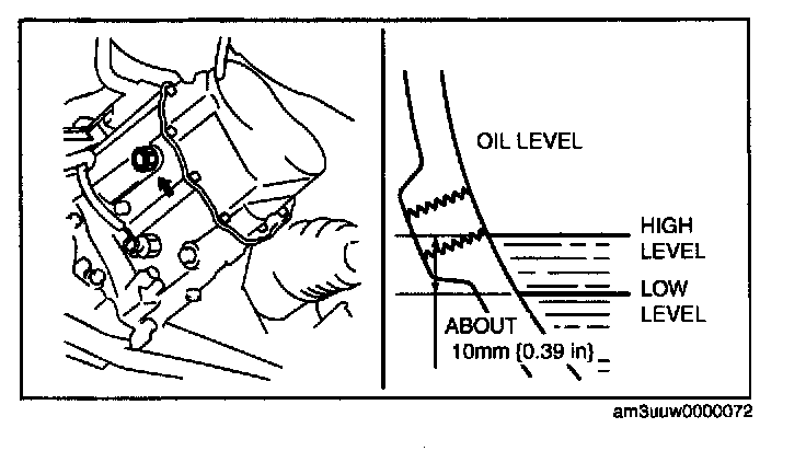 4. Verify that the oil is near the brim of the plug port. If the oil level is lower than the low level, add the specified amount and type of oil through the oil level plug hole.