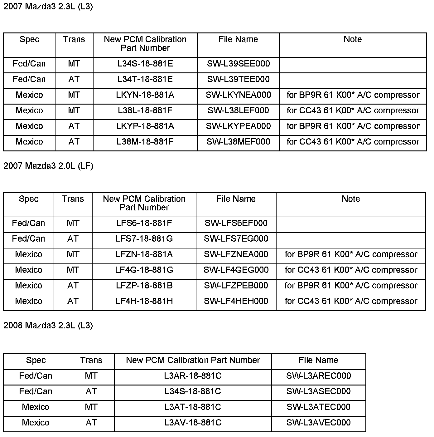2007-2008 Mazda3 vehicles (except CA 2.0/2.3L) with VINs lower than JM1BK**** ** 861723 (produced before November 27, 2007)
